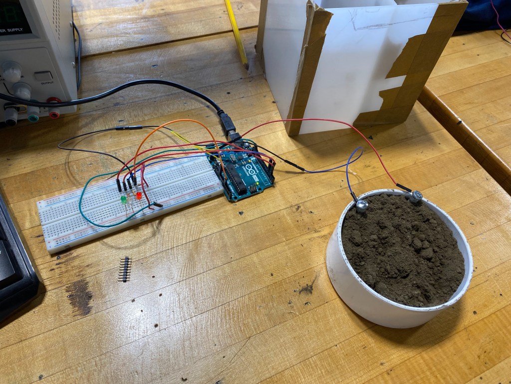 This week’s news update is brought to you by Prince Altidor ’23, a student who has built a workable DIY soil sensor out of a few wires, a few nuts and bolts, and some serious coding. The code is made up of digitally printed percentages of moisture content in dirt or silt, ranging from 0-600. It may not be the most accurate, but it shows when the range is too high to low and just about ideal with a line of LED’S. It also features a pump that turns on quickly when there isn’t enough water in the container and shuts off when there is. That’s it for this week’s update.