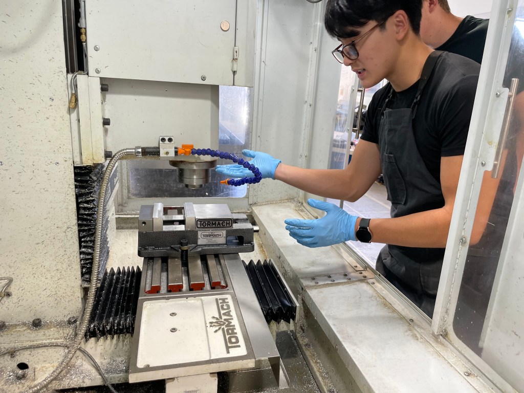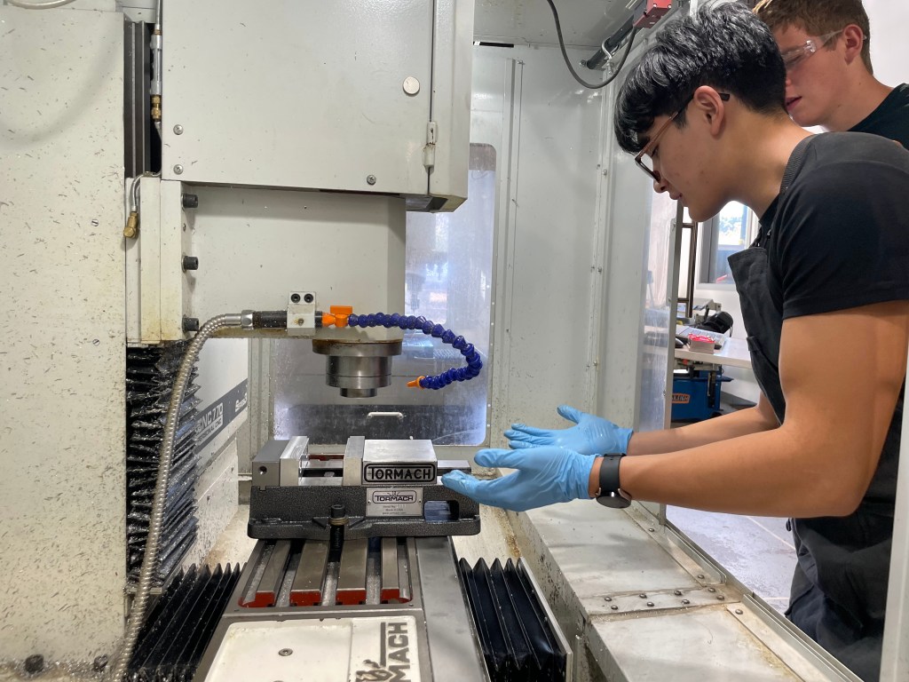 A few first week photos below showing senior Clark Barayuga ’23 demonstrating techniques on using the Tormach mills to sophomore Scott Campbell ’25 as well as some overall shop photos.