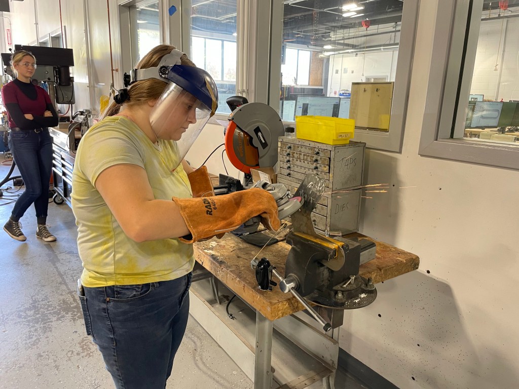 The machine shop remained busy throughout the week, with students still working on Turner’s Cubes and custom rings. In addition, Seniors Grace Kallberg and Jackie Whealan were using the plasma cutter to make a custom bike brackets. The brackets allow them to attach an additional cargo unit to a bicycle frame.