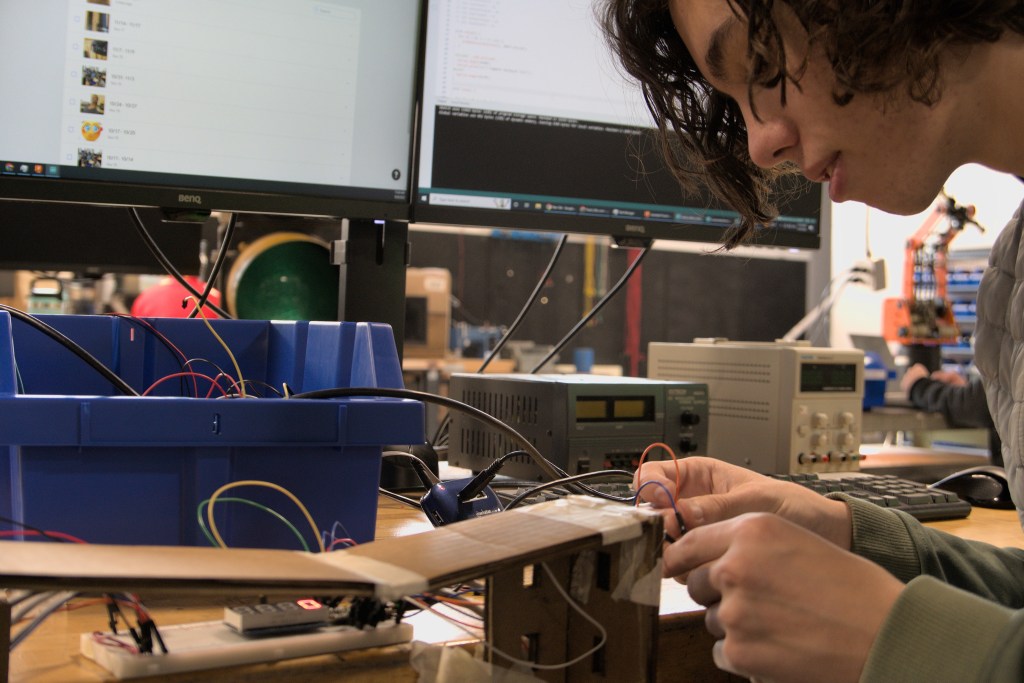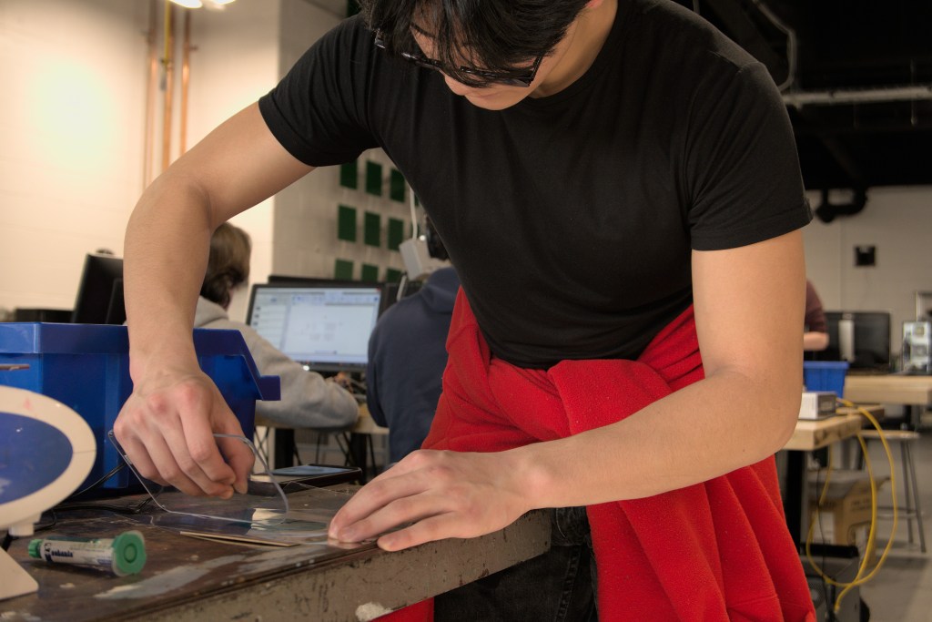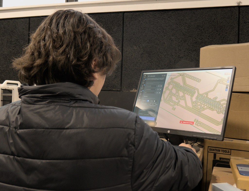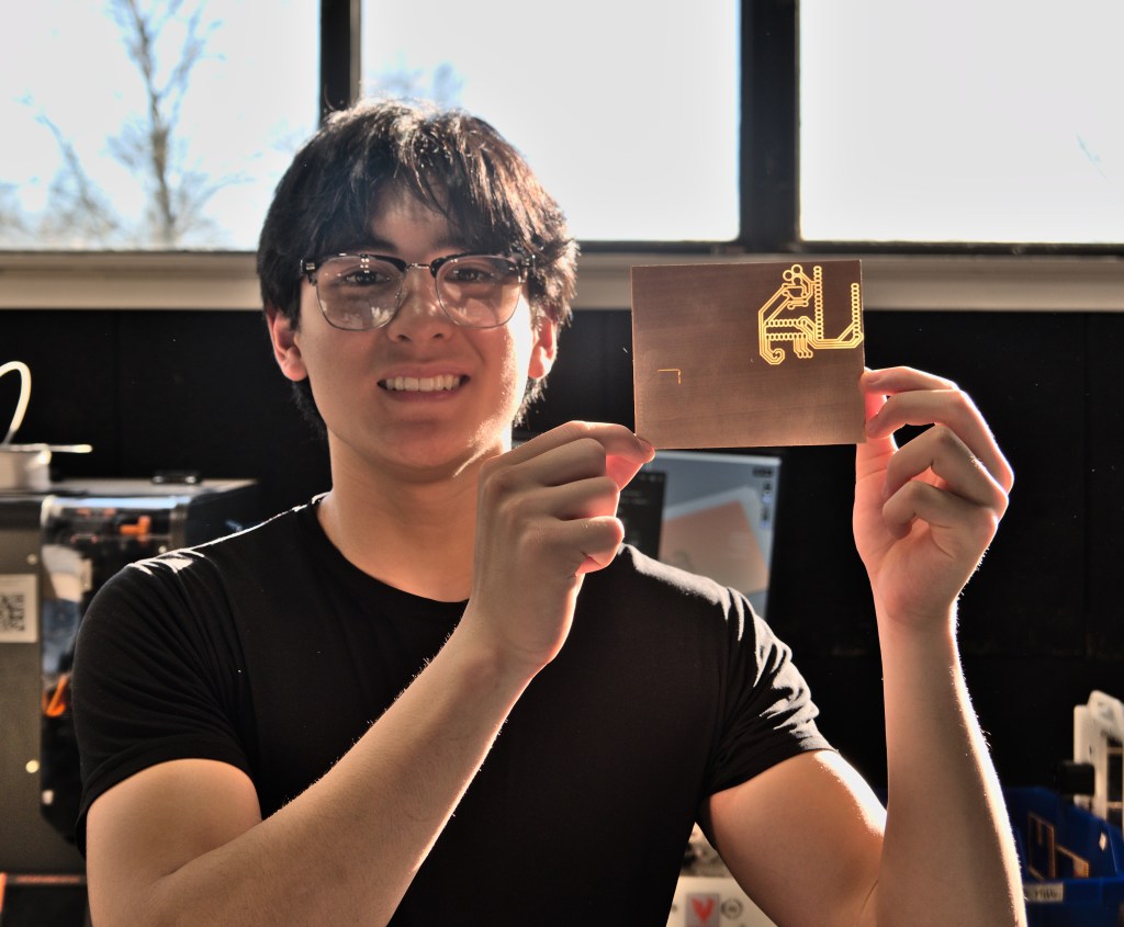This week many students were working on new projects in the shop. Seniors Clark Barayuga and Dom Bruno were busy perfecting custom made circuit boards on our Bantam Tools PBC Mill. Both were also interested in finding a technique to make a solder mask using solder paste we have in the shop. They were able to make at least one prototype, but the process was a bit messy. We will see if it can be refined for future use.
