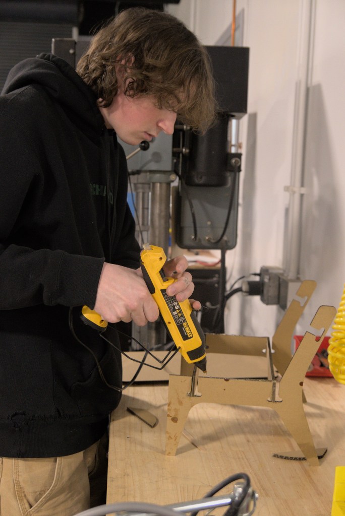 Additionally, Senior Ben Montello tested a prototype chair he has been working on. After finishing his design, he made a half scale laser cut mockup of the design. Next steps will be to finalize any design issues and then prepare CAM files for cutting on our CNC router.