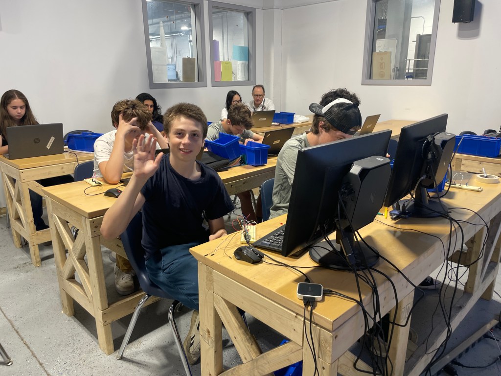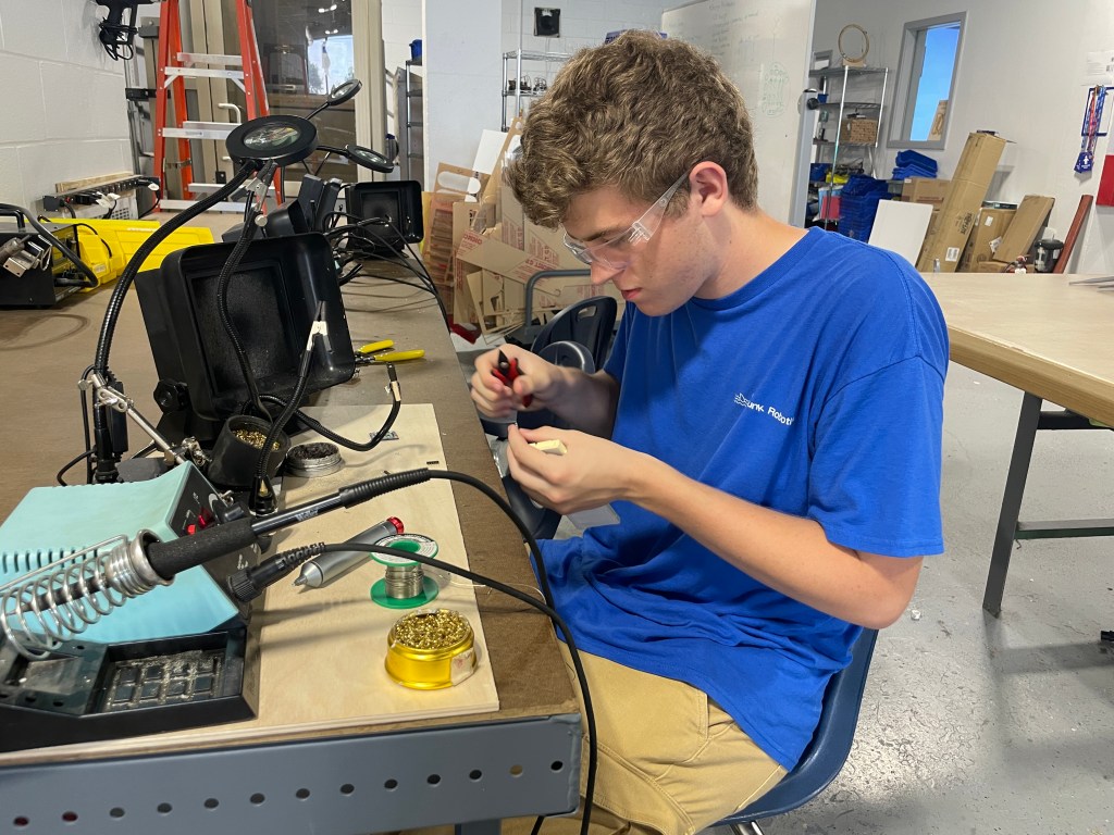 It was a busy week, so only a few photos to share below. You can see Theo Miller ’26 waving to the camera with the other sophomores in our classroom space. Sacha Silvia ’25, along with several other students, built their own custom fans to beat the heat during the week. Lastly, Scott Campbell ’25 works at a soldering table, which were updated over the summer break to be free of the clutter of wires that ran rampant previously. Please check out our shop photo album each week, which can be found on our website or at this link here.