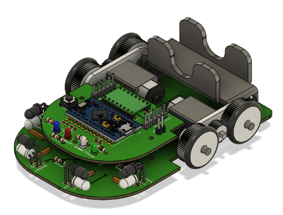 This is how the micromouse will mostly look like with all the components in the front with the motors in the middle, and the battery in the back. Since I added a new layer to the PCB the battery could have it own space in the back, and since I have not cut the PCB to test, I am hoping that because in the other PCB the battery was at the front, it made the micromuse heavier at the part so the micromouse was tilting to the front, and now with this one the weight of the micromouse is more distributed. I have yet to cut the PCB, so that will be left for next weeks work of cutting, soldering, and testing.