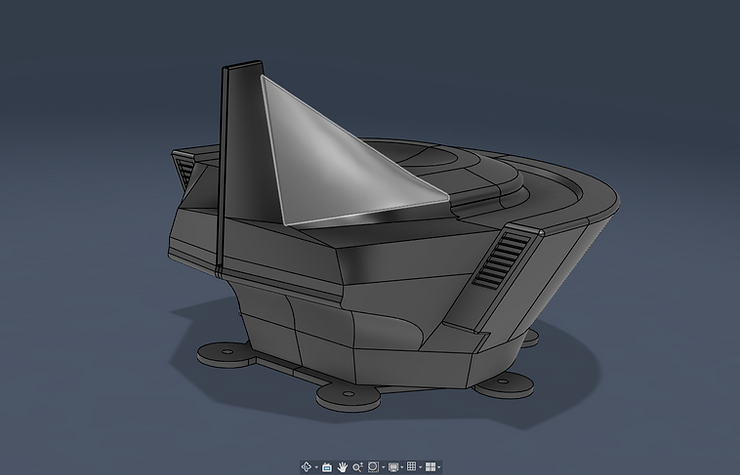 With the legs in place, the cover looks pretty good, and I also hollowed it out so that it would be light as well as being a place for the electronics to go, so you wouldn’t see them very much except for the bottom part I had to spend some time raising in it up though, since it was intersecing with the motors closest to it, but that got fixed eventually. Modeling something after something else with such a complex shape turns out to be pretty hard, but I think I did a pretty good job, and I also left a spot for a strip of red acrylic to simulate the light on it. I hope to print it out soon.